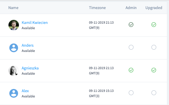 See who you’re working with. Check the team members’ timezone, availability and last login time.